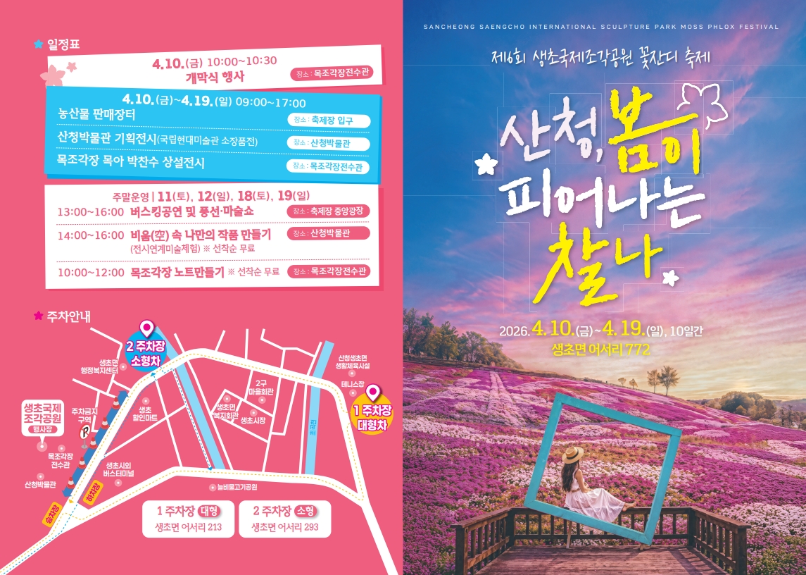 산청군은 오는 4월 10일부터 19일까지 생초면 어서리 생초국제조각공원 일원에서 ‘제6회 산청 생초국제조각공원 꽃잔디 축제’를 개최한다고 밝혔다.
