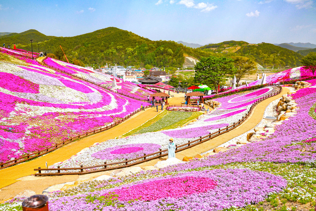 특히 단일 크기로는 국내 최대인 3만여 ㎡ 규모의 언덕과 둑길을 뒤덮은 진분홍의 꽃잔디는 마치 융단을 펼쳐놓은 듯하다.