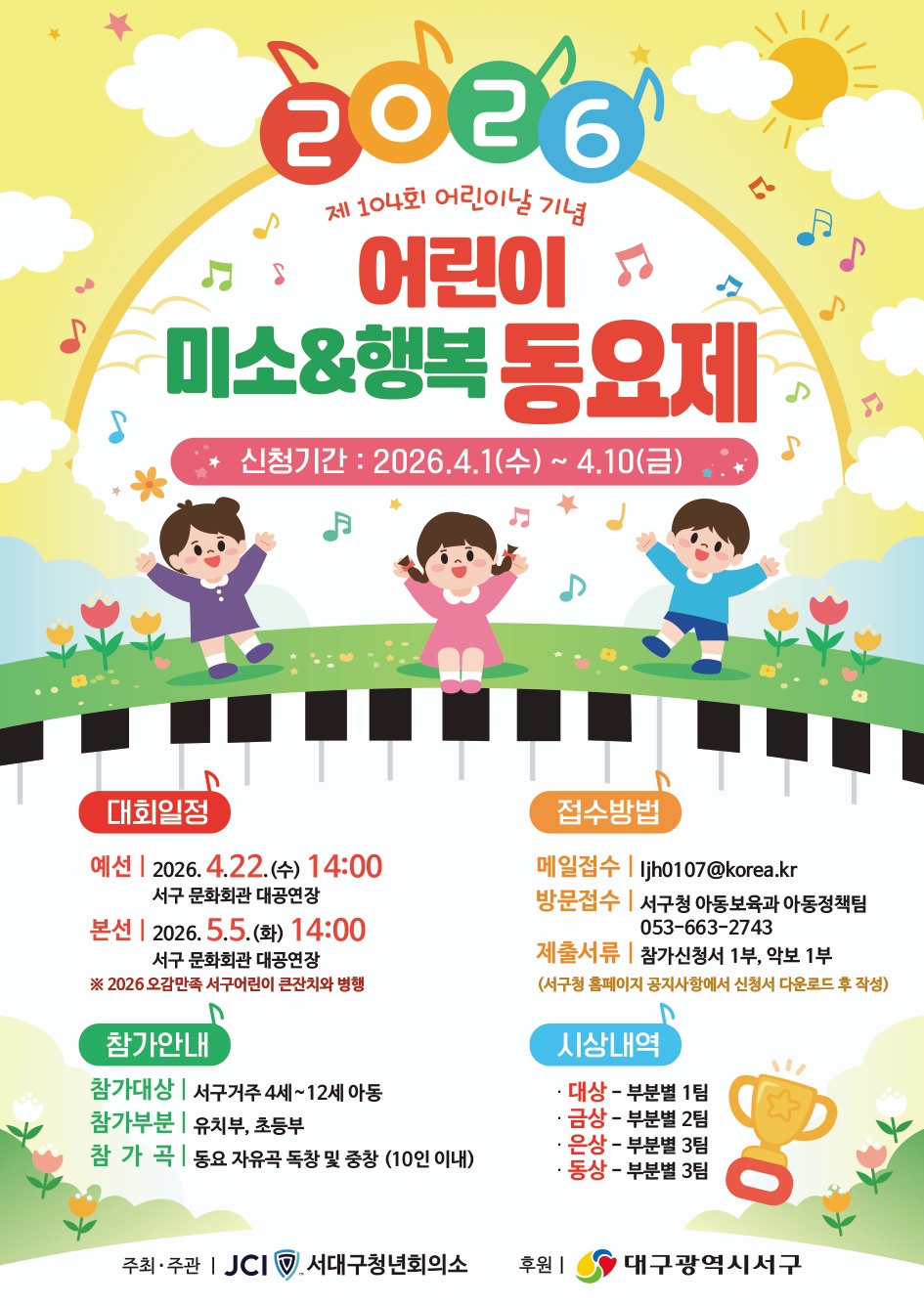 JCI서대구청년회의소(회장 김준현)는 대구 서구청의 후원으로 ‘어린이 미소&행복 동요제’를 개최한다.
