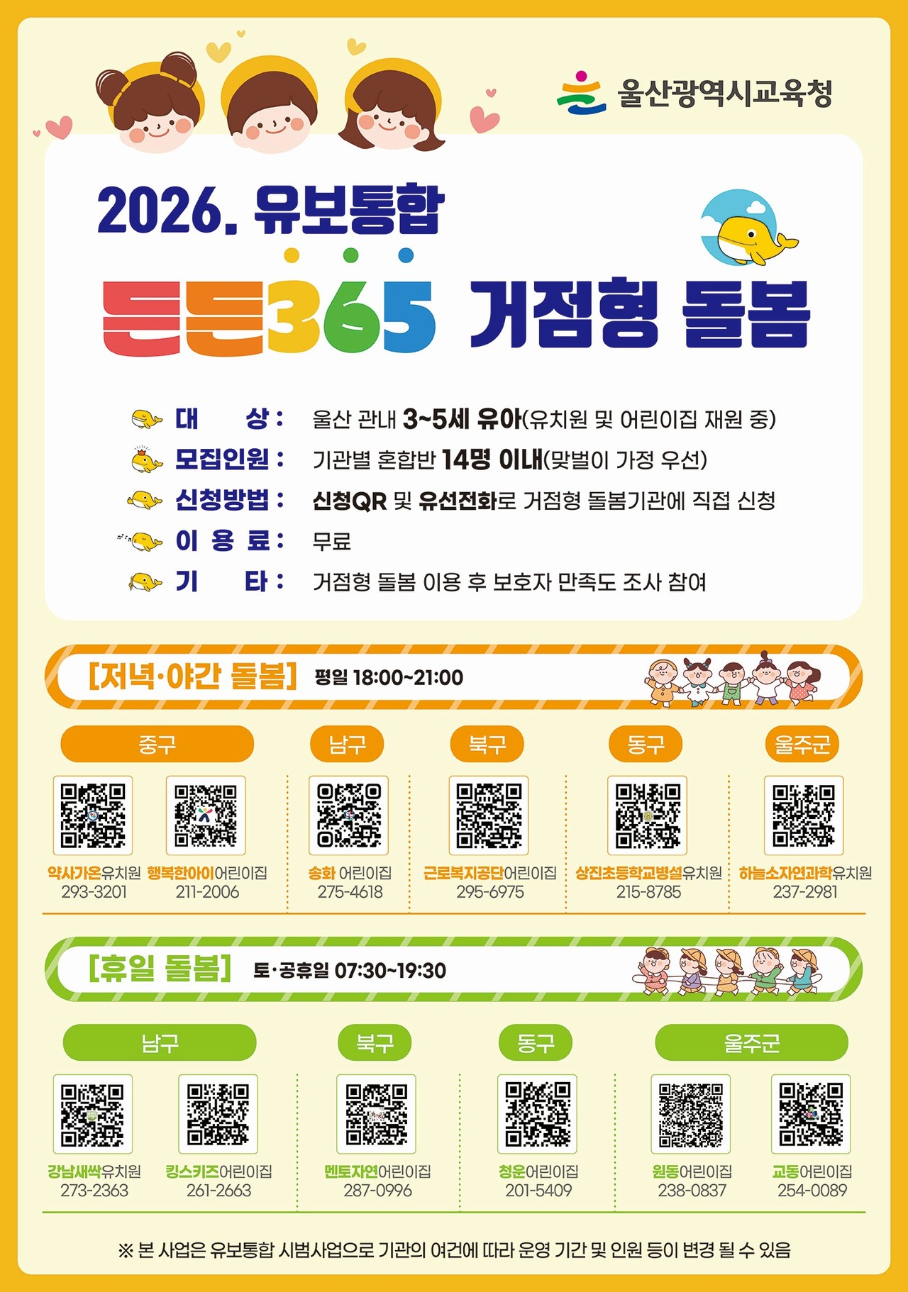 저녁·야간 돌봄 거점기관은 ‘약사가온유치원, 상진초등학교병설유치원, 하늘소자연과학유치원, 행복한아이어린이집, 송화어린이집, 근로복지공단울산어린이집’이다.