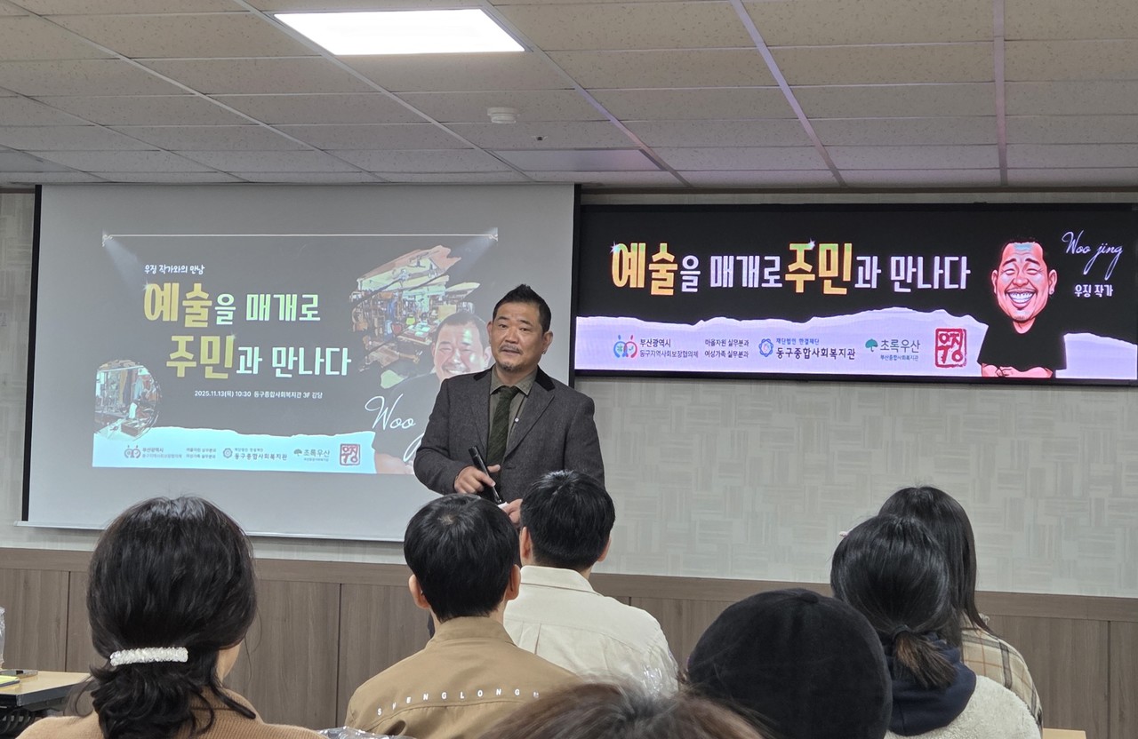 부산 동구지역사회보장협의체(민간위원장 이재영)는 지난 13일, 동구종합사회복지관(관장 김창근)에서 동구 안창마을에서 활동 중인 우징 작가의 특강을 성황리에 개최했다.
