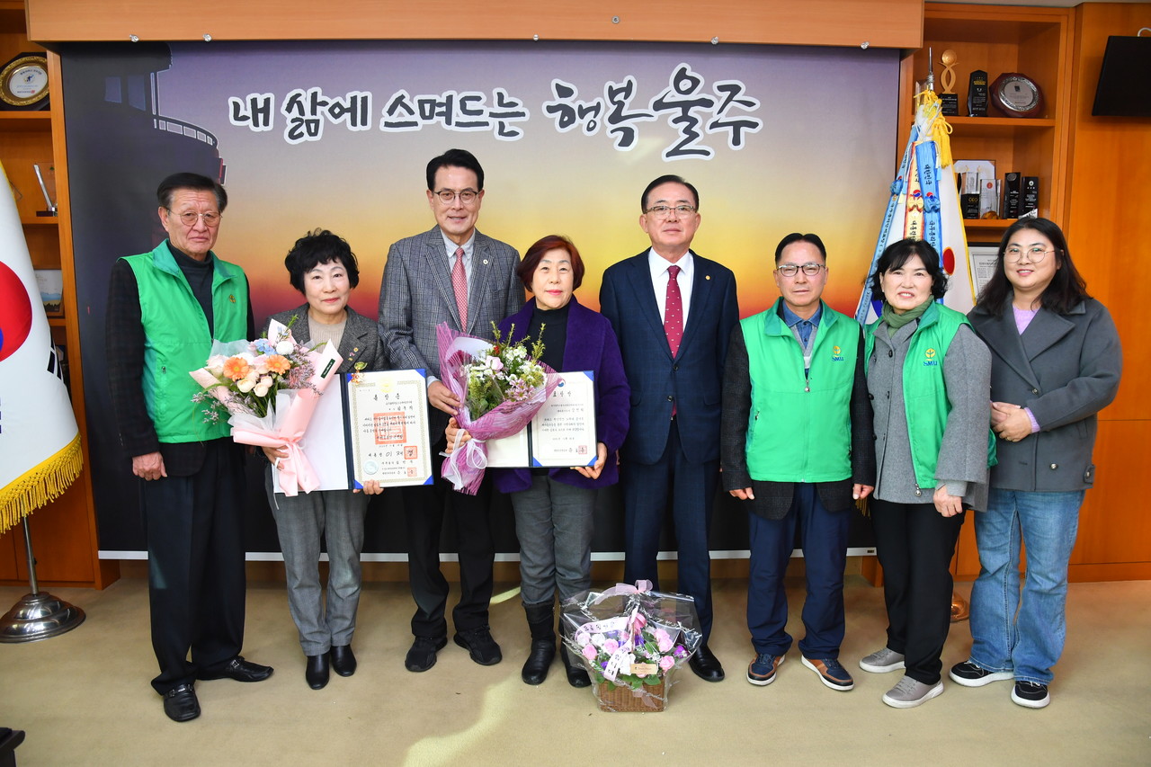 김옥희 울주군 새마을부녀회장(왼쪽 두번째)과 김연희 웅촌면 새마을부녀회장(왼쪽 네번째)이 새마을훈장 근면장, 행안부장관 표창을 수상한 가운데 이순걸 울주군수가 12일 군청 소회의실에서 훈장 및 표창 전수식을 가진 뒤 수상자들과 기념촬영을 하고 있다.