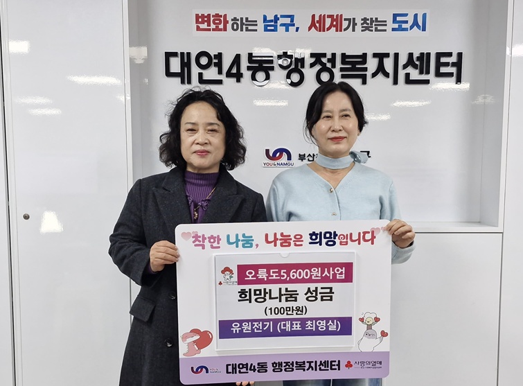 부산 남구 대연4동 소재 유원전기(대표 최영실)는 지난 12월 12일 대연4동행정복지센터에 성금 100만 원을 기탁했다.