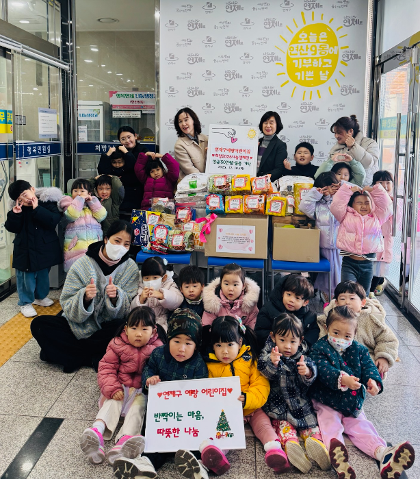 연제구 연산9동(동장 이진희)은 12월 16일 연제구예랑어린이집(원장 강기향)으로부터 교직원들이 자발적으로 모은 성금(50만원)과 원아들이 조금씩 정성껏 모은 성품(양곡, 라면 등)을 기탁받았다.