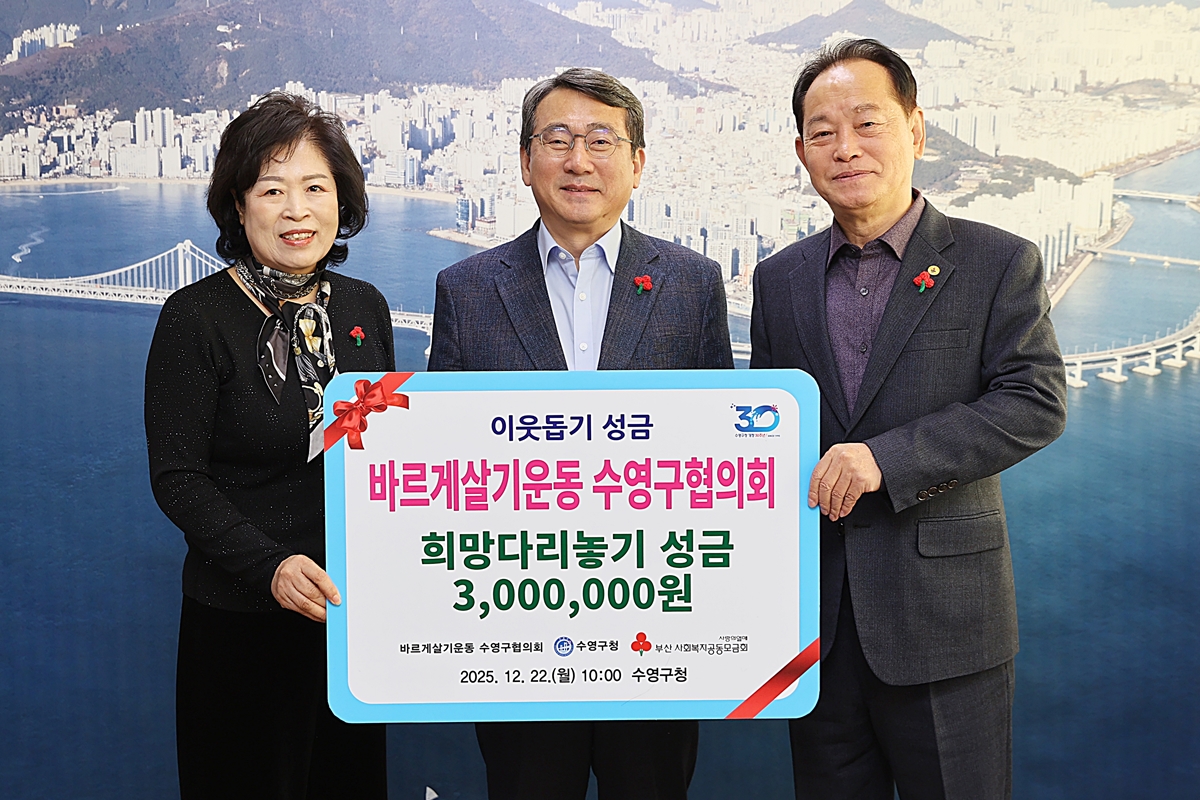 부산광역시 수영구(구청장 강성태)는 22일 구청장실에서 ‘연말 이웃사랑 나눔 일일호프’ 행사 수익금으로 조성한 성금 500만 원을 저소득 취약계층에 전달해 달라며 바르게살기운동 수영구협의회(회장 서진태)로부터 기탁받았다.