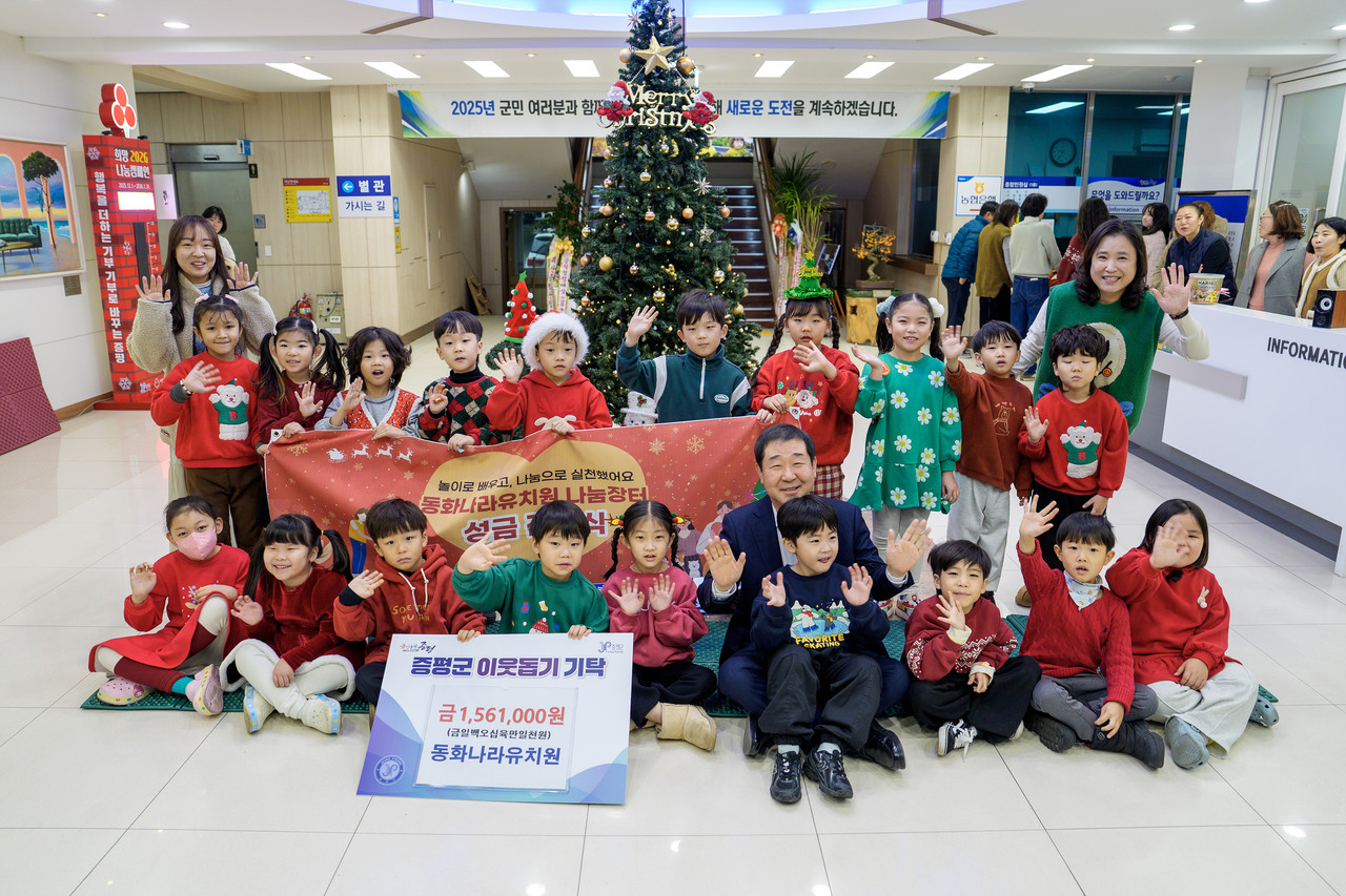 충북 증평군은 동화나라유치원(원장 정미영)이 24일 군청에 방문해 이웃돕기 성금 156만 원을 기탁했다고 밝혔다.