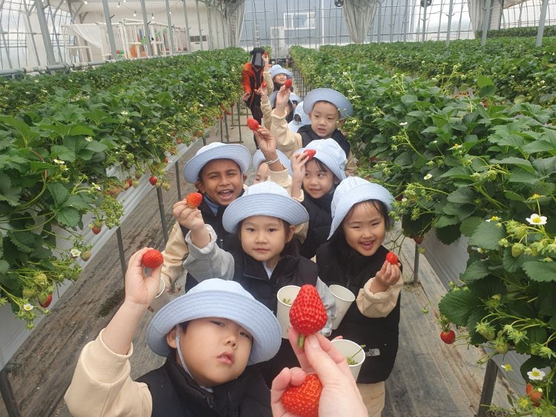 딸기농장에 도착한 유아들은 농장 선생님으로부터 딸기가 자 라는 과정과 올바른 수확 방법에 대해 설명을 들었다. 이어 새콤달콤한 향기가 가득한 비닐하우스 안에서 잘 익은 딸기를 직접 수확하며 자연이 주는 선물을 경험했다.