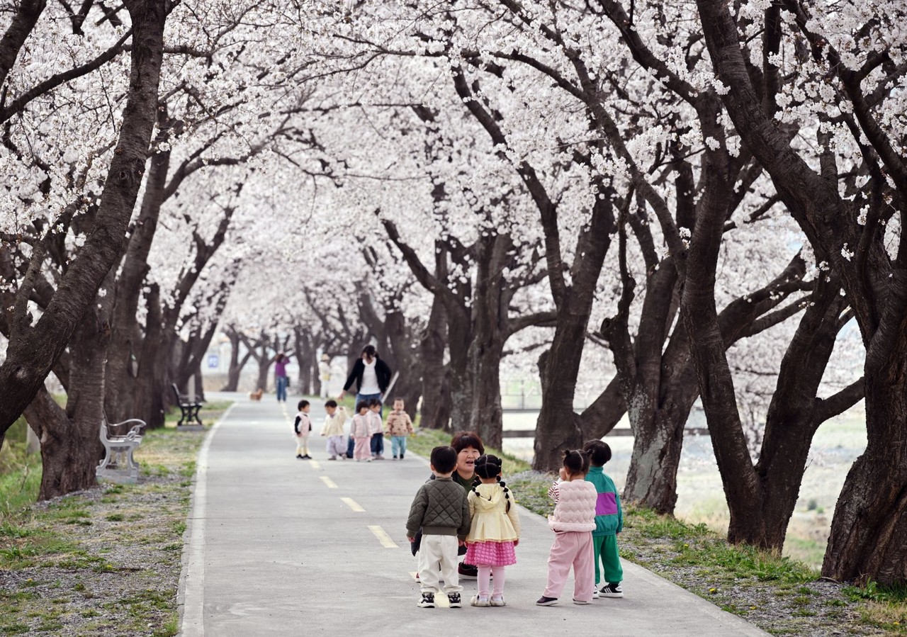 밀양시 밀양강변 일원에서 활짝 핀 벚꽃 아래 봄 소풍 나온 어린이들이 즐거운 한때를 보내고 있다.