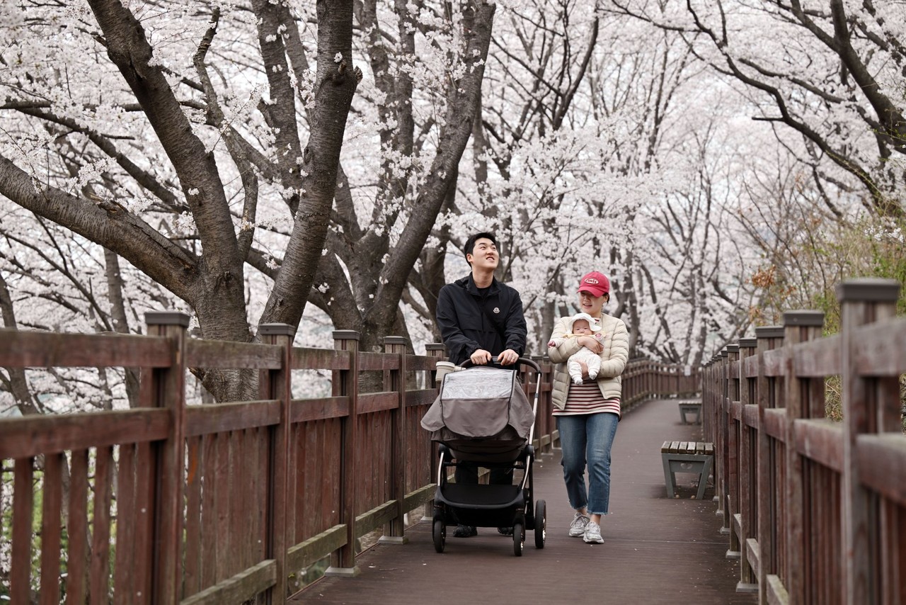 밀양시 삼랑진읍 안태공원으로 나들이 온 가족이 활짝 핀 벚꽃을 즐기고 있다.