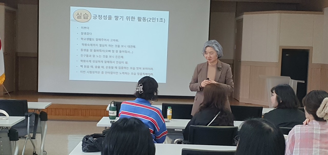 강사(지현영)는 네 가지 자녀 양육자 유형, ‘축소 전환형-방임형-억압형-감정 코치형’을 제시하면서 부모의 평소 말 습관을 점검하고 가정에서 실천 가능한 구체적인 5단계 감정코칭 방법을 활용하여 학부모들의 직접 체험을 이끌었다.
