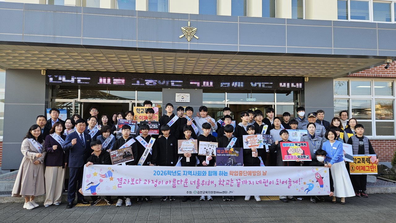 김천교육지원청(교육장 모태화) Wee센터는 4월 2일(수) 김천중학교 앞에서 ‘결과보다 과정이 아름다운 너를 위해, 학교는 늘 네 편이 되어줄게’ 라는 슬로건 아래, 학생 주도형 등굣길 학업중단예방 캠페인을 진행했다.