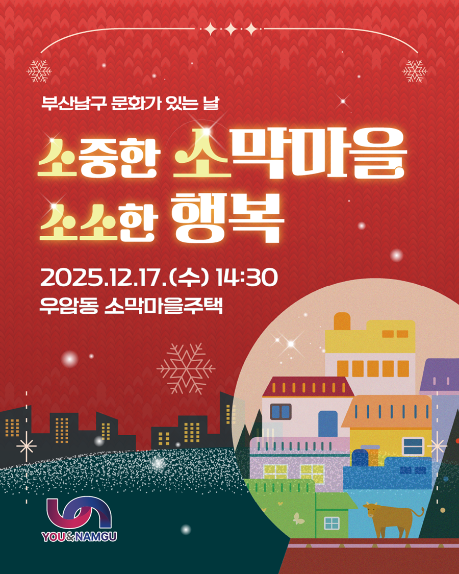 부산 남구(구청장 오은택)는 오는 12월 17일(수) 오후 2시 30분, 우암동 소막마을 주택에서 2025 남구 문화가 있는 날 「소중한 소막마을, 소소한 행복」 공연을 개최한다고 밝혔다.