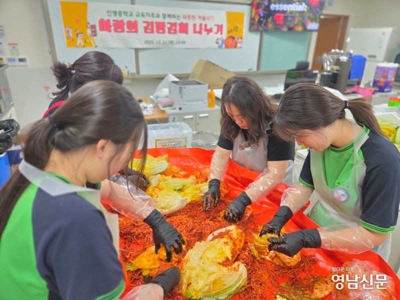 인평중학교(학교장 홍경옥)는 12월 11일(목) 가사실에서 학생 주관 김장나눔 활동 『아삭』을 실시했다. 『아삭』은 김치를 먹을 때 나는 소리이자, 지역사회에 따뜻한 정(情)을 나누는 마음을 담은 이름이다.